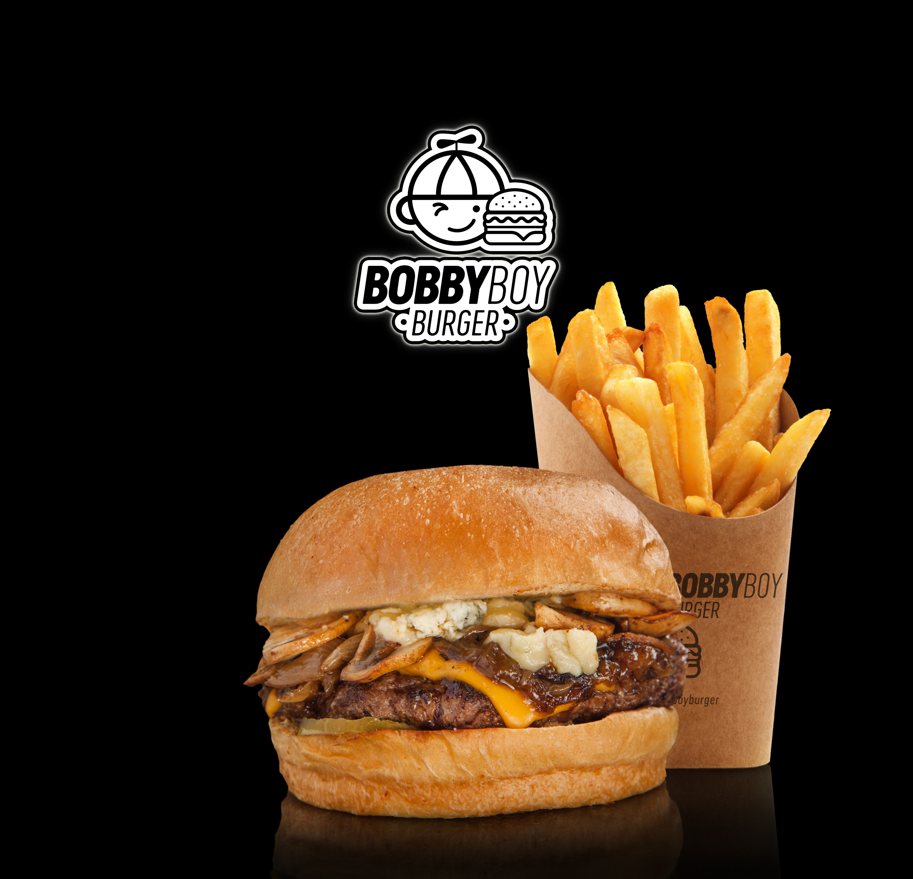 150 grs de carne premium, pan de papa, cebolla caramelizada, queso cheddar, queso azul, champiñones, pepinillos y salsa Bobby. incluye porción de papas.