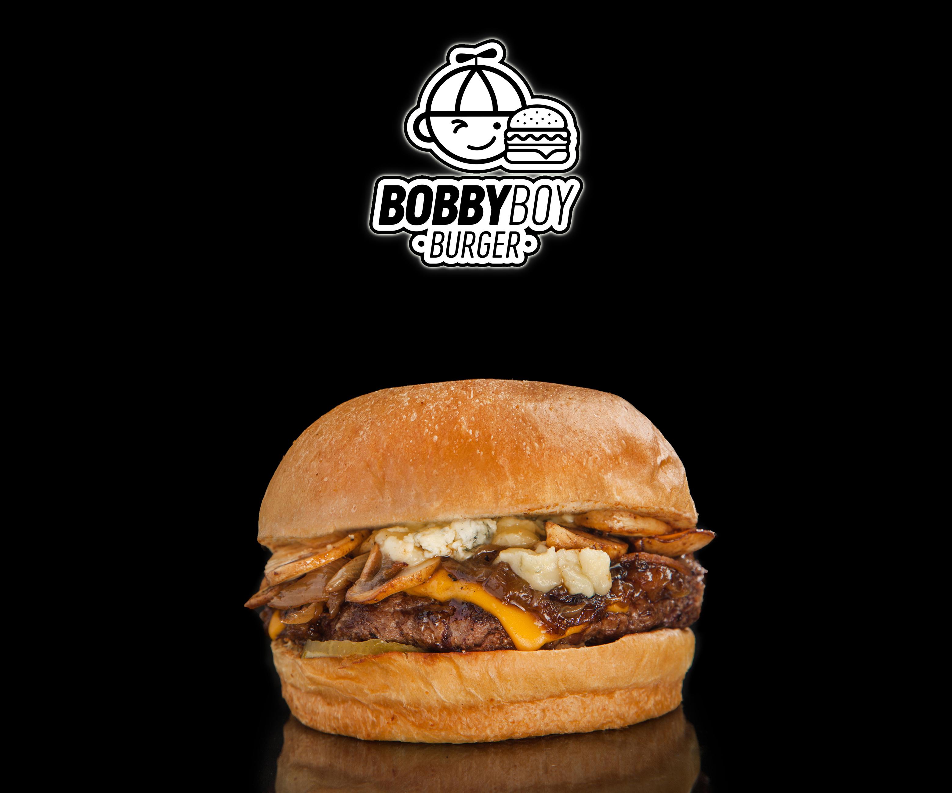 150 grs de carne premium, pan de papa, cebolla caramelizada, queso cheddar, queso azul, champiñones, pepinillos y salsa Bobby.