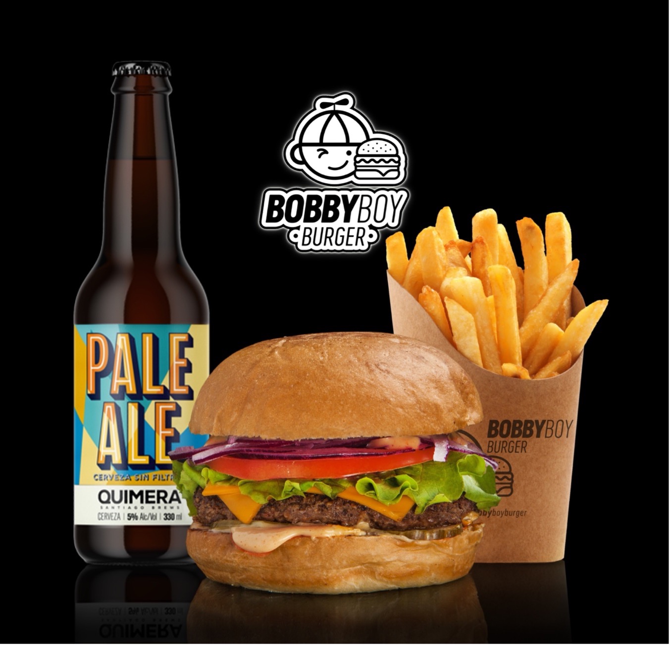 150 grs de carne premium, pan de papa ,queso cheddar ,tomate, lechuga, cebolla morada ,pepinillos y salsa Bobby. incluye Cerveza Quimera y porción de papas.
